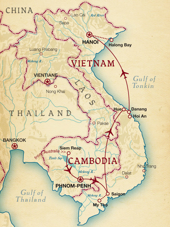 Siem Reap • Saigon • My Tho • Hue • Hoi An • Hanoi • Halong