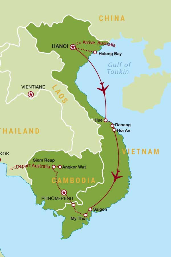 Hanoi • Halong Bay • Hue • Hoi An • Saigon • My Tho • Can Tho • Chau Doc • Phnom Penh • Siem Reap